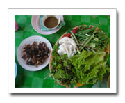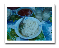 Lao cuisine, like that of neighbouring Southeast Asian countries, revolves around rice. This isn't the long grain rice that Vietnamese, Central Thai and most Westerners are used to eating, however, but khao niaw, or glutinous 'sticky rice' deftly rolled into a neat, small ball and eaten with the hand. In Vientiane, the Lao capital, as indeed in all other large towns, long grain rice or khao jao is readily available--but khao niaw remains the basic staple of the Lao people, and is the single most distinctive feature of Lao cuisine. Another essential is fish sauce or naam paa, which is the universal Lao condiment. Sticky rice, then, forms the central theme of virtually every Lao meal. It is generally accompanied by a selection of dips, parboiled vegetables, salad, soup and various curried meat dishes or fish dishes. The sticky rice is generally served in a simple but attractive woven bamboo container called a tip khao. It's considered bad luck not to replace the lid on top of the tip khao at the end of the meal. Whilst sticky rice is eaten by hand, long grain rice is always eaten with a spoon and fork. Chopsticks are reserved for Chinese-style noodle dishes or for use in Chinese and Vietnamese restaurants. Lao food is quite similar to Thai food--and indeed identical to much of the food eaten in Thailand's ethnically Lao Northeast. Dishes are generally cooked with fresh ingredients that include vegetables, poultry (chicken, duck), pork, beef and water buffalo. Fish and prawns are readily available but are nearly always freshwater, since Laos is a landlocked country relatively far from the sea. Mutton and goat are not eaten except by the country's small South Asian Muslim population, nearly all of whom live in Vientiane. Up c Popular Lao dishes include tam som--really the equivalent of Thai som tam--a spicy salad made of sliced green papaya mixed with chilli peppers, garlic, tomatoes, ground peanuts, field crab, lime juice and fish sauce. This is often eaten with sticky rice and ping kai or grilled chicken. Another standby is laap, a spicy dish of minced meat, poultry or fish mixed with lime juice, garlic, chilli pepper, onion and mint. Meats used in laap are generally cooked--unlike laap dip in northern Thailand--but can also be raw. If you are concerned about this, ask for laap suk, or cooked laap. Other popular Lao dishes include tom khaa kai, or chicken soup with galingale and coconut milk, kaeng jeut, or mild soup with minced pork and bitter gourd, and khao laat kaeng, or curry served on a bed of khao jao long grain rice--all virtually identical with Thai dishes of the same name served on the other side of the Mekong. For breakfast or a snack at any time of the day, Vietnamese pho or noodle soup is extremely popular, as are yaw jeun or deep-fried spring rolls. For a variant, try yaw dip or fresh spring rolls. Vietnamese food is good and plentiful, especially in Vientiane and the larger cities. The same is true of Chinese food, which is generally Cantonese or Hokkienese, though some Yunnanese food is for sale in Vientiane. Other popular cuisines available include Thai--just about everywhere--Italian and French (especially in Vientiane and Luang Prabang) and South Asian (only in Vientiane). Laos is an excellent place for breakfast, chiefly because of the French colonial legacy. French bread or khao jii is freshly baked each day and served with pate, fried eggs and omelette. Good coffee is also available, and it's possible to start the day with coffee and croissants in the major urban centres, though up country the croissants may have to be replaced with pah thawng ko or deep-fried Chinese dough sticks. Fruit